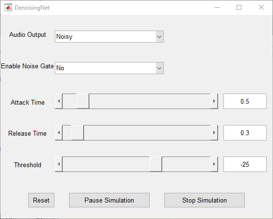 speechDenoisingRealtimeApp はシミュレーションを対話的に実行するように設計された UI (ユーザー インターフェイス) を起動します。UI ではパラメーターを調整でき、結果はシミュレーションにすぐに反映されます。さらに、ノイズ除去された出力で操作するノイズ ゲートを有効または無効にして、ノイズをさらに減らしたり、ノイズ ゲートのアタック時間、リリース時間、しきい値の微調整を行うことができます。ノイズを含むオーディオ、クリーンなオーディオまたはノイズ除去後のオーディオを UI によって再生することができます。