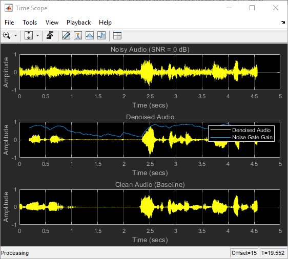 スコープは、クリーンな信号、ノイズを含む信号およびノイズ除去後の信号とノイズ ゲートの増幅率をプロットします。