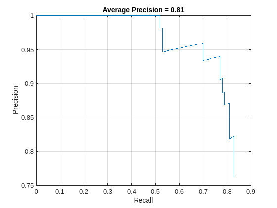 figure plot(recall,precision) xlabel('Recall') ylabel('Precision') grid on title(sprintf('Average Precision = %.2f',ap))