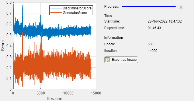 monitor = trainingProgressMonitor( ... Metrics=["GeneratorScore","DiscriminatorScore"], ... Info=["Epoch","Iteration"], ... XLabel="Iteration"); groupSubPlot(monitor,Score=["GeneratorScore","DiscriminatorScore"])