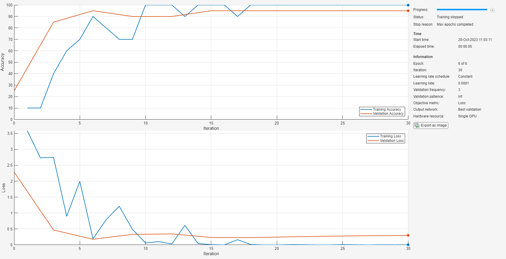 options = trainingOptions("sgdm", ... MiniBatchSize=10, ... MaxEpochs=6, ... Metrics="accuracy", ... InitialLearnRate=1e-4, ... Shuffle="every-epoch", ... ValidationData=augimdsValidation, ... ValidationFrequency=3, ... Verbose=false, ... Plots="training-progress");
