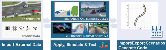 シーンの作成、合成センサー データの生成、実環境センサー データからのシナリオの作成、シナリオ バリアントの作成、シミュレーション環境でのアルゴリズムのテスト