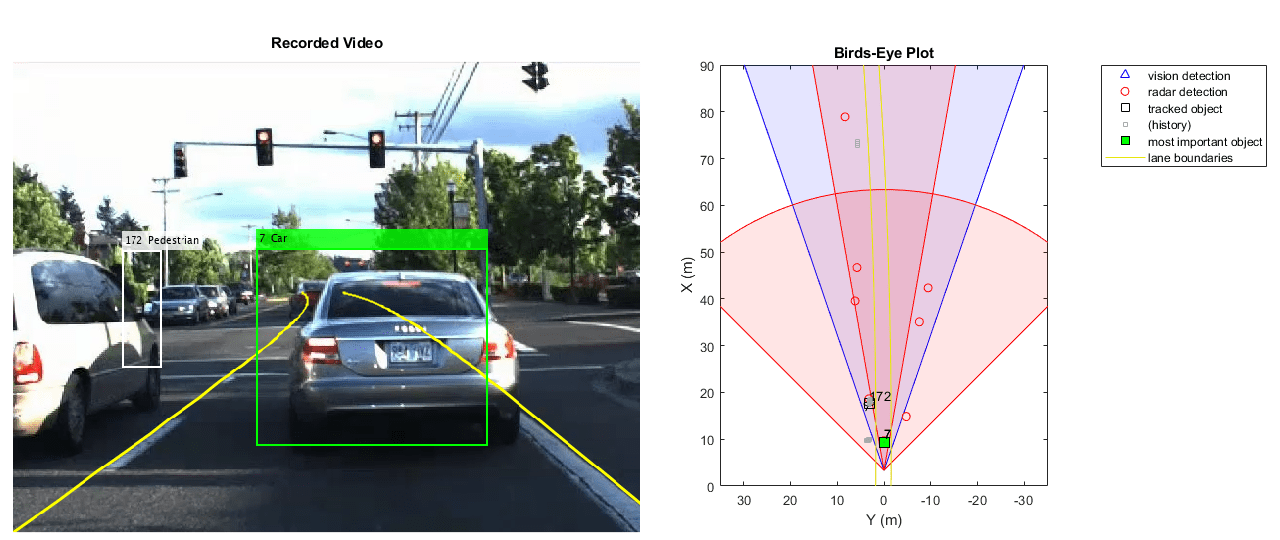 % If a previous tracker is defined, clear it clear trackingForFCW_kernel % Set up the display videoFile = '01_city_c2s_fcw_10s.mp4'; sensorConfigFile = 'SensorConfigurationData.mat'; [videoReader, videoDisplayHandle, bepPlotters, sensor] = helperCreateFCWDemoDisplay(videoFile,sensorConfigFile); % Read the recorded detections file detfile = '01_city_c2s_fcw_10s_sensor.mat'; [visionObjects, radarObjects, imu, lanes, timeStep, numSteps] = helperReadSensorRecordingsFile(detfile); % An initial ego lane is calculated. If the recorded lane information is % invalid, define the lane boundaries as straight lines half a lane % distance on each side of the car. laneWidth = 3.6; % meters egoLane = struct('left', [0 0 laneWidth/2], 'right', [0 0 -laneWidth/2]); % Prepare some time variables timeStamp = 0; % Time since the beginning of the recording index = 0; % Index into the recorded sensor data % Define the position and velocity selectors: % The state vector is in constant acceleration: [x;vx;ax;y;vy;ay] % Constant acceleration position: [x;y] = [1 0 0 0 0 0; 0 0 0 1 0 0] * State positionSelector = [1 0 0 0 0 0; 0 0 0 1 0 0]; % Constant acceleration velocity: [x;y] = [0 1 0 0 0 0; 0 0 0 0 1 0] * State velocitySelector = [0 1 0 0 0 0; 0 0 0 0 1 0];