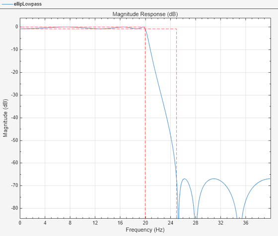 は、オブジェクト ellipFilter = ellip(designSpecs,SystemObject=true)designSpecs 内の仕様を使用して、楕円 IIR デジタル フィルターを設計します。