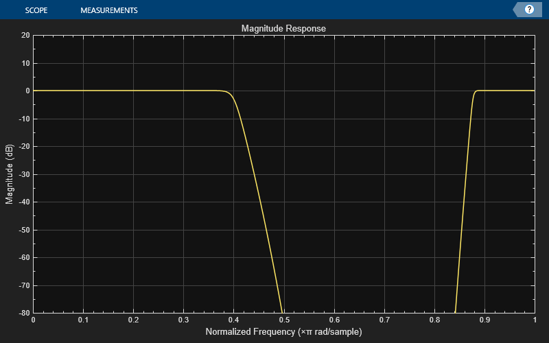 filterViz = dsp.DynamicFilterVisualizer(NormalizedFrequency=true,YLimits=[-80 20]); filterViz(psosFilt)