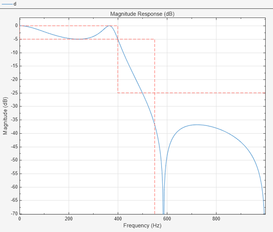 Generate MATLAB function>Digital Filter Object. The code appears in the editor.function designedFilter = lowpassiir1filt designedFilter = designfilt('lowpassiir', ... 'PassbandFrequency',400,'StopbandFrequency',550, ... 'PassbandRipple',5,'StopbandAttenuation',25, ... 'SampleRate',2000,'DesignMethod','ellip', ... 'MatchExactly','passband','ScaleSOS',true); end