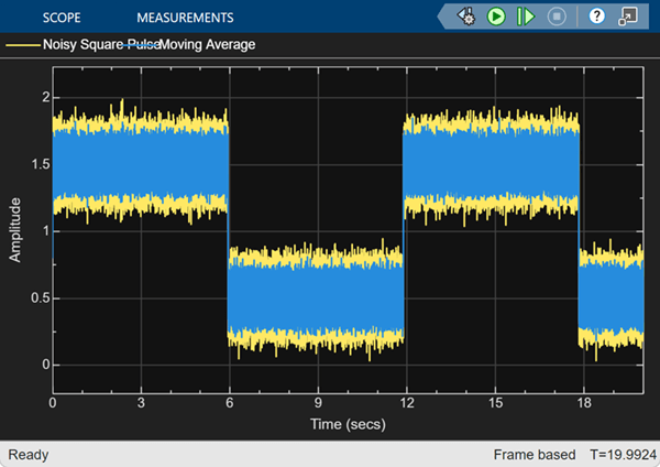 Moving Average ブロックを使用し、各フレーム全体で入力信号の移動平均を計算します。このブロックでは、スライディング ウィンドウ法を使用して移動平均を計算します。入力端子 [WL] からウィンドウの長さを入力として渡します。