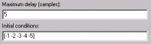 • Vector containing D elements with which to initialize memory samples U(2:D+1), where D is the Maximum delay. For a scalar input and the parameters in the next figure, the block initializes U(2:6) with values [-1, -1, -1, 0, 1].