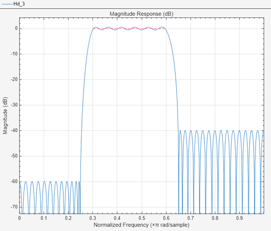 d.B1Ripple = 10^(-60/20); % Attenuation for the first stopband d.B3Ripple = 10^(-40/20); % Attenuation for the second stopband Hd = design(d,"equiripple",SystemObject=true)