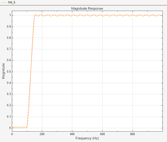 Hd = design(d,"equiripple",B1ForcedFrequencyPoints=60,... SystemObject=true); hFiltAnalyzer.addDisplays(1); hFiltAnalyzer.addFilters(Hd);