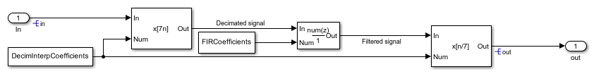 この例では、モデル仕様は Simulink モデル dspifircodegen の InterpolatedFIR サブシステムです。このサブシステムでは、入力は FIR 間引き、FIR フィルター処理、および FIR 内挿のカスケードに通されます。