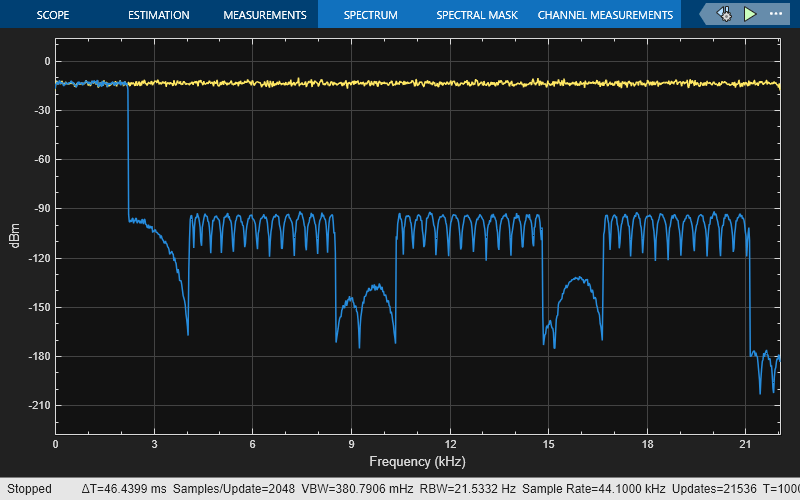 モデルをシミュレートして、内挿された FIR の設計と実装の動作を調査できます。このモデルでは、Spectrum Analyzer ブロックを使用して振幅応答を表示します。モデルを実行するには、[シミュレーション] タブの [実行] をクリックします。シミュレーション時間は 1000 秒に設定されています。
