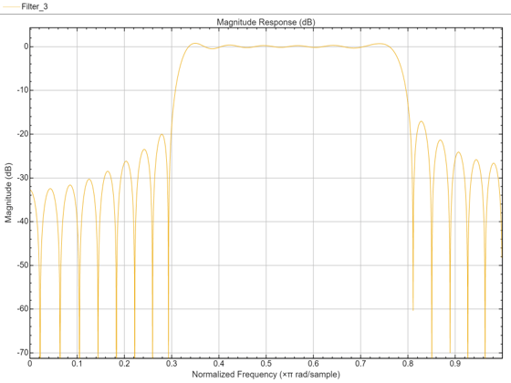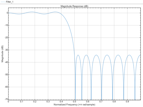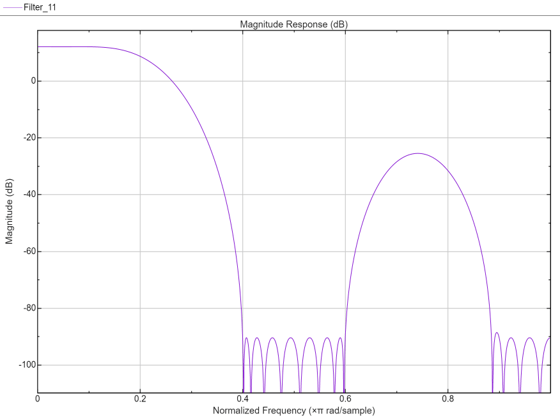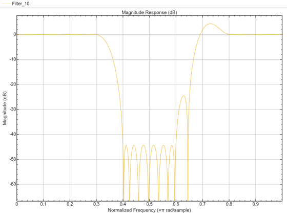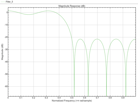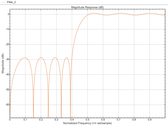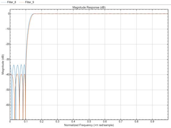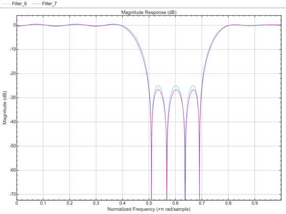 ここで、2 番目の阻止帯域の等リップル減衰は、intfilt を使用して設計されたフィルターの最小の阻止帯域の減衰量よりも約 6 dB 大きいことに注目してください。また、通過帯域リップルは、intfilt を使用して設計されたフィルターのリップルよりは大きいですが、それでも非常に小さいことにも注目してください。