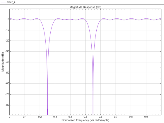 これは、指定された単一点帯域に対して設計されたフィルターを示したものです。周波数点 f = 0.25 および f = 0.55 は、単一帯域点です。これらの点にはゼロに近づくゲインがあります。