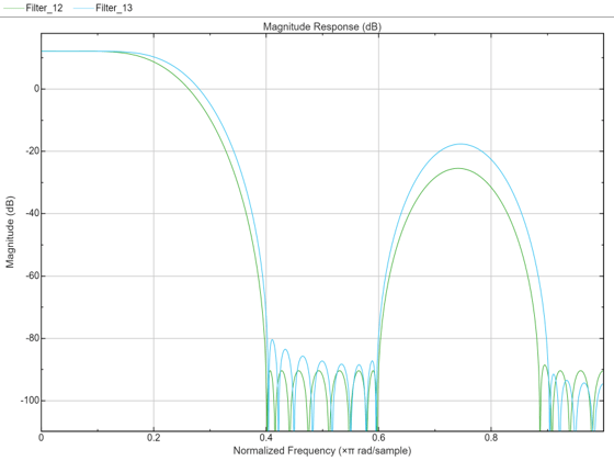 ここでは、firpm を使用して設計されたフィルター (青) と intfilt を使用して設計された 30 次のフィルター (緑) の比較を示しています。