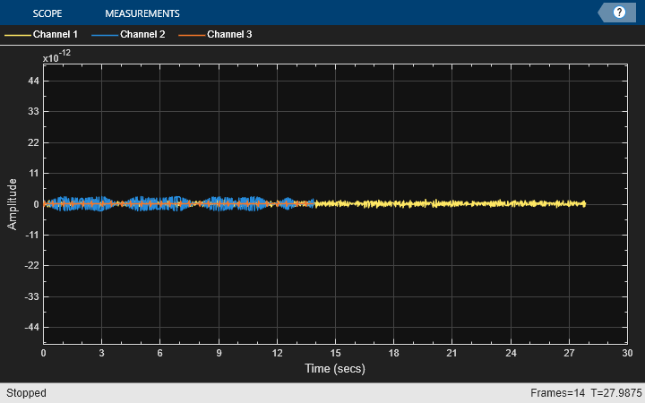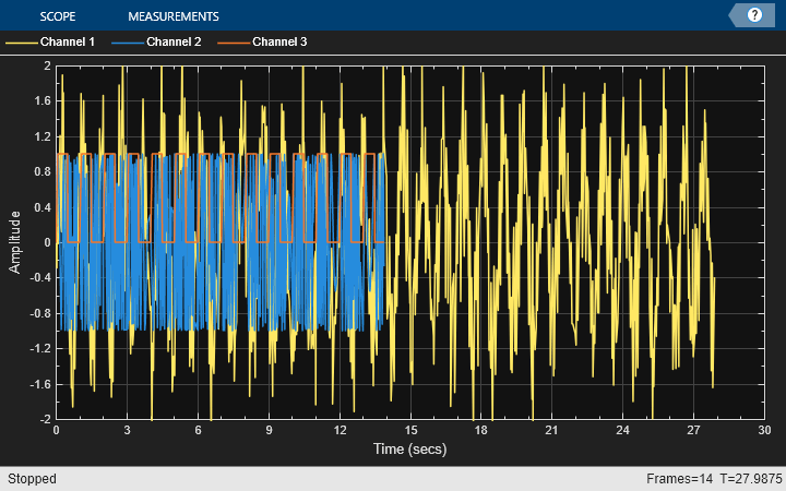 scope1 = timescope(Name = 'Three Channel WTM: Original (delayed)', ... SampleRate = fs, ... TimeSpan = 30, ... YLimits = [-2 2], ... ShowLegend = true, ... TimeSpanOverrunAction = 'Scroll'); pos = scope1.Position; pos(3:4) = 0.9*pos(3:4); scope1.Position = [pos(1)-1.1*pos(3) pos(2:4)]; scope2 = timescope(Name ='Three Channel WTM: Reconstructed', ... Position = pos, ... SampleRate = fs, ... TimeSpan = 30, ... YLimits = [-2 2], ... ShowLegend = true, ... TimeSpanOverrunAction = 'Scroll'); scope3 = timescope(Name = 'Three Channel WTM: Error', ... Position = [pos(1)+1.1*pos(3) pos(2:4)], ... SampleRate = fs, ... TimeSpan = 30, ... YLimits = [-5e-11 5e-11], ... ShowLegend = true, ... TimeSpanOverrunAction = 'Scroll'); Tx_Ch3 = [ones(35,1);zeros(45,1)]; % Generate the Channel 3 signal