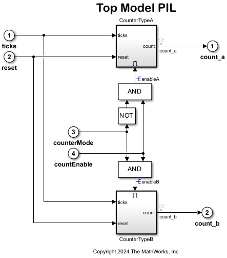 5. When the PIL simulation is completed, a logsOut variable is created in the base workspace. The logsOut data contains the PIL simulation results. You can access the logged data for signals count_a and count_b using the following commands: