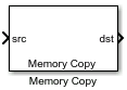 In generated code, the Memory Copy block copies variables or data to and from processor memory as you have configured with block parameters. Your model can contain as many of these blocks as you require to manipulate memory on your processor.