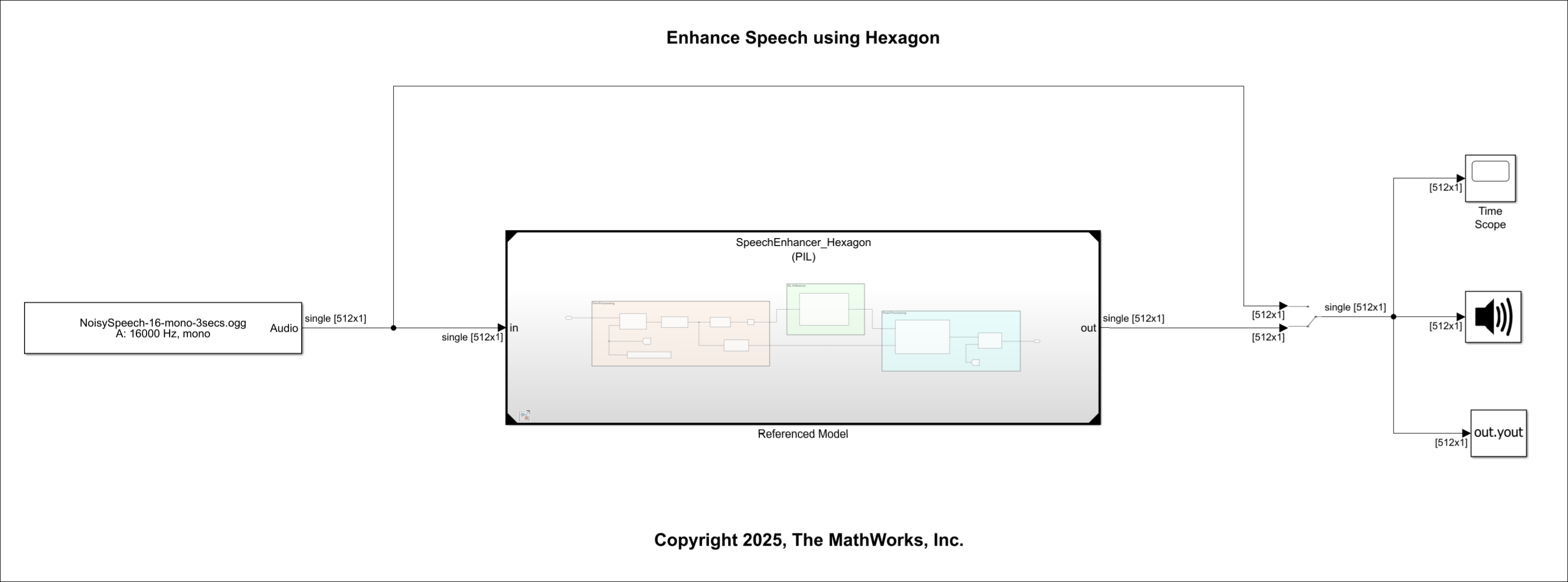 This example demonstrates how to deploy a Simulink® model designed to enhance a noisy speech audio on Qualcomm Hexagon DSP using Embedded Coder® Support Package for Qualcomm® Hexagon® Processors. Refer to the corresponding enhanceSpeech (Audio Toolbox) MATLAB function for more information on the model functionality and algorithm.