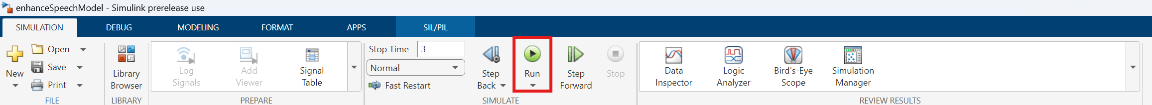 To simulate the top-level model in normal mode, click Run under the Simulation tab on the Simulink toolstrip.