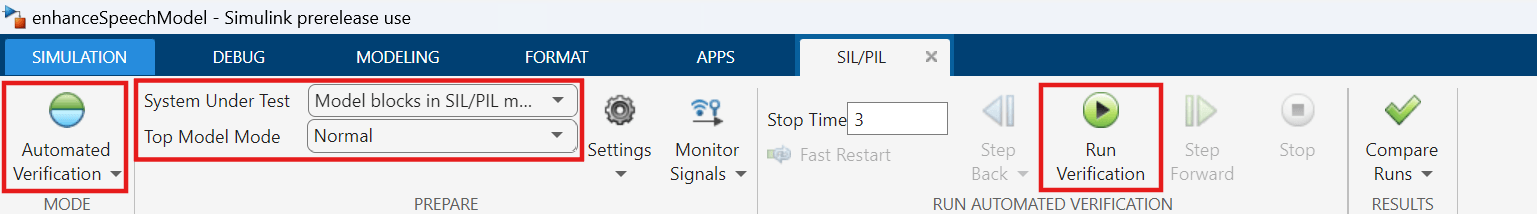 3. Set the System Under Test to Model blocks in SIL/PIL mode.