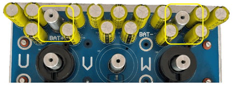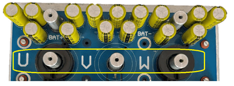 Connect the three motor phases to the U, V, and W terminals on the Inverter board.