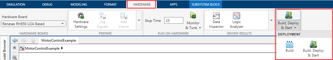 2. Click Build, Deploy & Start on the Hardware tab to deploy the target model to the hardware.