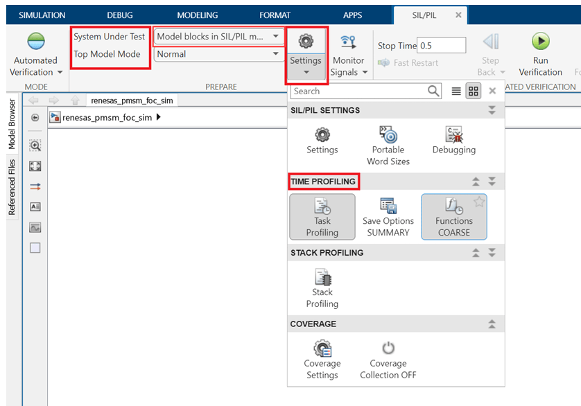renesas_pmsm_foc_sim.slxmodel, click Apps and then select SIL/PIL Manager.