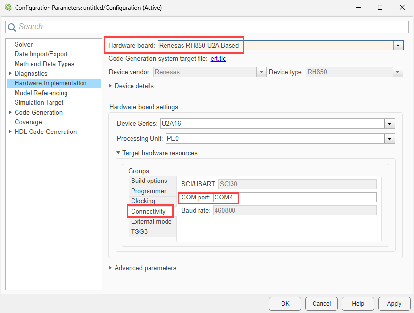 3. In the Configuration Parameters dialog box, navigate to Hardware Implementation > Hardware board and select Renesas RH850 U2A Based board.