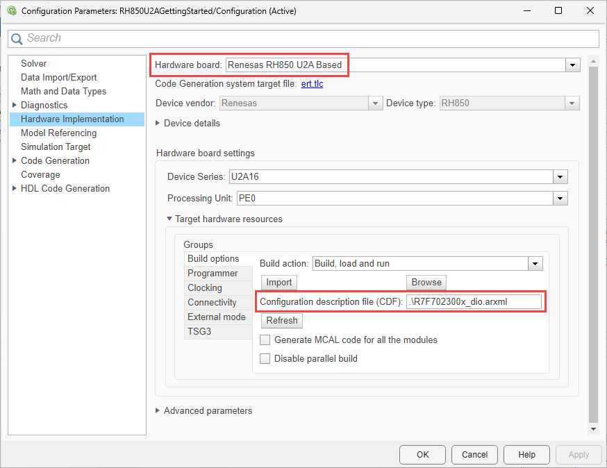 R7F702300x_dio.arxmlis added as the configuration description file in Build options. To verify click Modeling > Model Settings to open the Configuration Parameters dialog box. Navigate to Hardware Implementation > Target hardware resources > Build options.