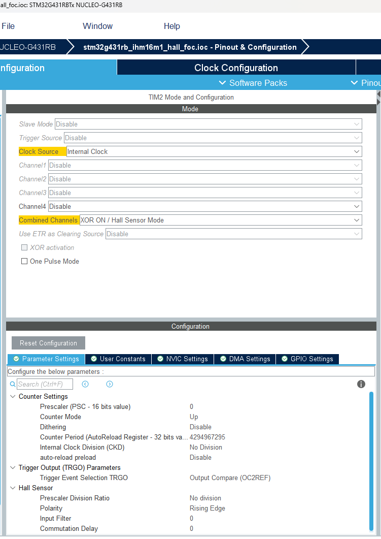Timer2は [XOR ON/Hall Sensor Mode] で構成されています。このタイマーにより、ホールの状態の遷移時間に関する情報が得られます。この目的には 32 ビット タイマーを使用するのが理想的です。16 ビット タイマーはホールの遷移が発生する前にオーバーフローする可能性があるためです。その結果、取得データが不正確になります。これは、モーターが低い速度で動作しているときに顕著になります。