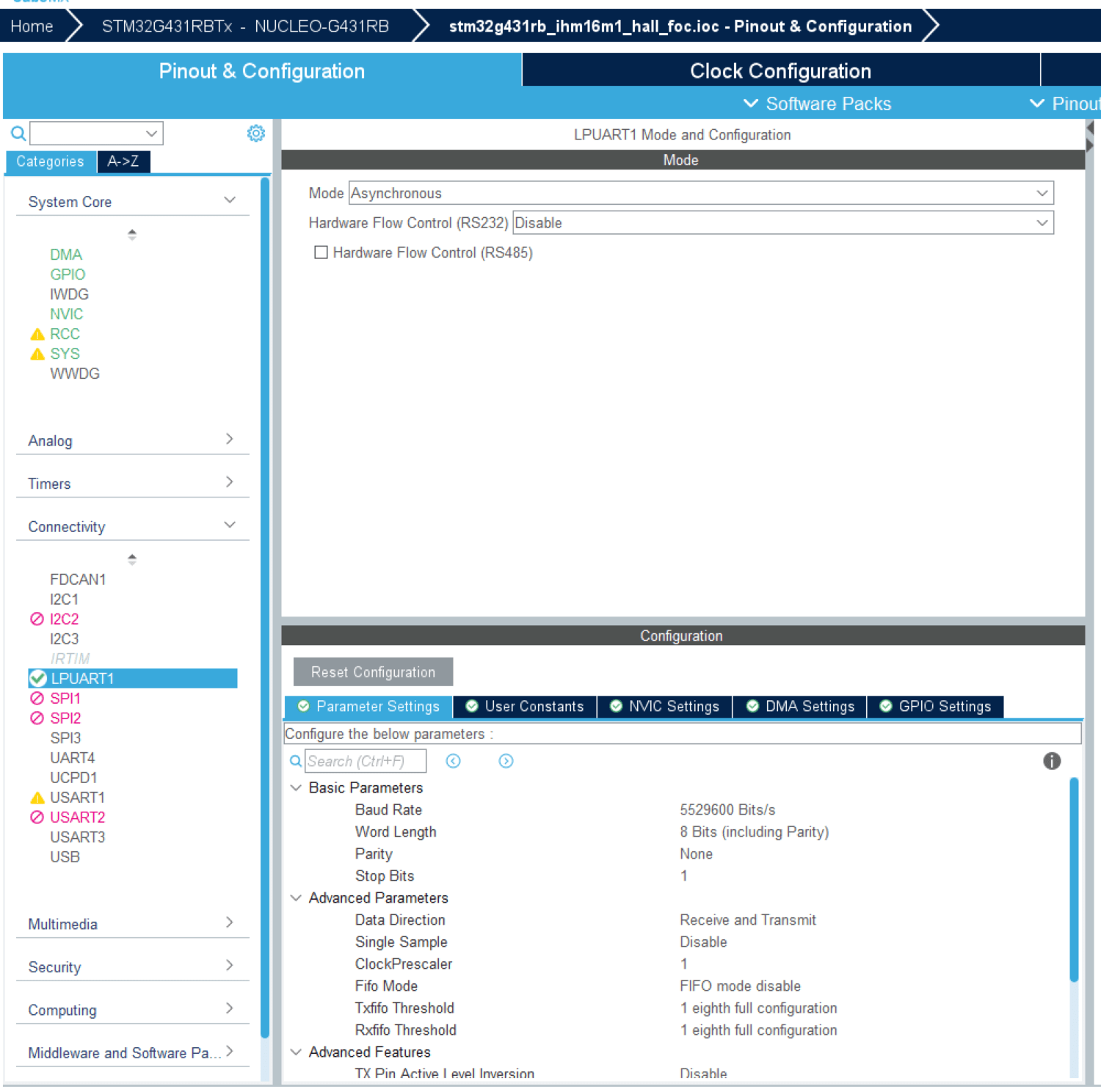 ホストとターゲットのシリアル通信には LPUART モジュールを使用します。STM32CubeMX で設定されているボー レートが STM32MotorControlData.m スクリプトの target.SCI_baud_rate 変数と一致していることを確認します。