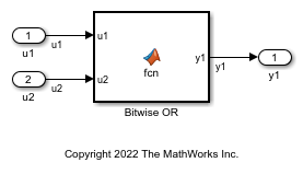 この例では、ビット論理を生成コードに実装する MATLAB Function ブロック メソッドを示すために、ビット単位 OR、'|' を使用します。