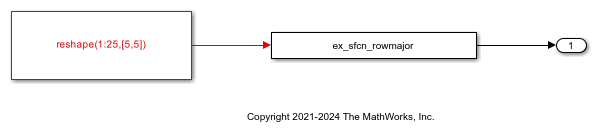 S-Function Builder を使用して S-Function を生成する場合、S-Function の優先方向を指定にはパラメーター [配列のレイアウト] を使用します。詳細については、Build S-Functions Automatically Using S-Function Builderを参照してください。レガシ コード ツールを使用した C 関数の統合では、legacy_codeの convertNDArrayToRowMajor オプションを使用します。S-Function Builder およびレガシ コード ツールは、ノーマル モードでのシミュレーション中に S-Function が行優先の配列レイアウトに設定される場合、それに先立って転置を適用します。