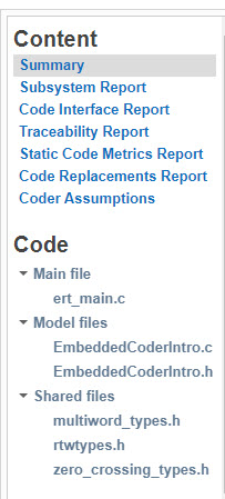 このレポートには、EmbeddedCoderIntro.c、関連するユーティリティとヘッダー ファイル、トレーサビリティと検証レポートが含まれます。