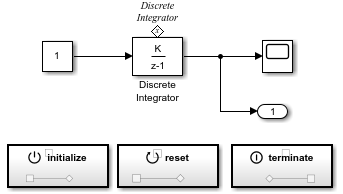 Initialize Function ブロックは State Writer ブロックを使用して Discrete Integrator ブロックの初期状態を設定します。Terminate Function ブロックは Discrete Integrator ブロックの状態を読み取る State Reader ブロックを含めます。