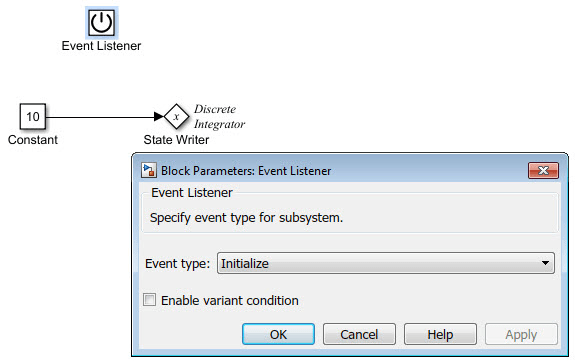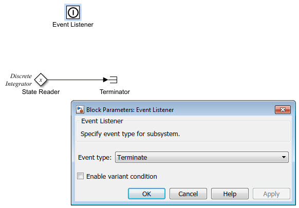 初期化関数および終了関数の Event Listener ブロックのパラメーター [イベント タイプ] を、それぞれ Initialize と Terminate に設定します。初期化関数は State Writer ブロックを使用して Discrete Integrator ブロックの入力値を 10 に初期化します。終了関数は State Reader ブロックを使用して Discrete Integrator ブロックの状態を読み取ります。