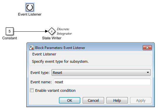 データ コード インターフェイスを使用するように構成されているモデルの場合、Initialize Function ブロックまたは Terminate Function ブロックを含めることで、リセット イベントに応答するコードを生成できます。Event Listener ブロックの [イベント タイプ] パラメーターを Reset に設定し、リセットにブロックを構成します。また、[イベント名] パラメーターを設定します。既定の名前は reset です。