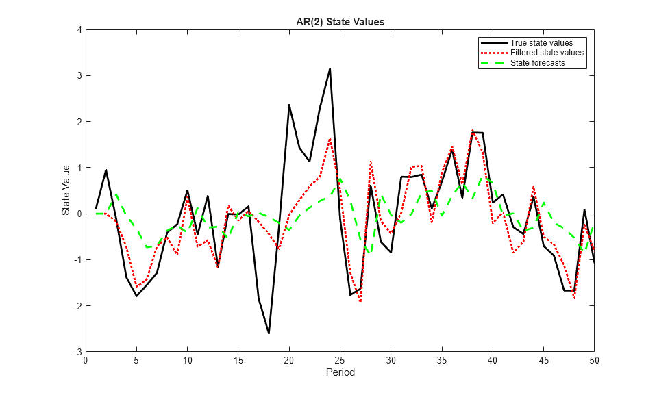 figure plot(1:T,x(:,1),'-k',1:T,FilteredStates(:,1),':r',... 1:T,ForecastedStates(:,1),'--g','LineWidth',2); title('AR(2) State Values') xlabel('Period') ylabel('State Value') legend({'True state values','Filtered state values','State forecasts'}); figure plot(1:T,x(:,2),'-k',1:T,FilteredStates(:,2),':r',... 1:T,ForecastedStates(:,2),'--g','LineWidth',2); title('MA(1) State Values') xlabel('Period') ylabel('State Value') legend({'True state values','Filtered state values','State forecasts'});