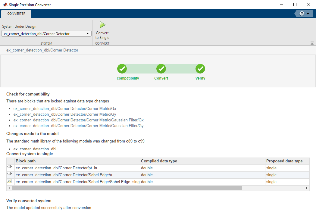 変換プロセス中に、コンバーターはユーザーが指定したすべての倍精度データ型と、倍精度にコンパイルされる出力データ型を単精度データ型で置き換えます。コンバーターは組み込み整数データ型、Boolean データ型または固定小数点データ型を変更しません。