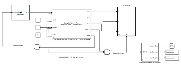 The RealTwoByTwoSVDModel and ComplexTwoByTwoSVDModel models contain blocks that implement the real and complex two-by-two SVD algorithms, respectively, optimized for HDL applications. These blocks use the AMBA AXI handshake protocol. The valid/ready handshake process is used to transfer data and control information. This two-way control mechanism allows both the manager and subordinate to control the rate at which information moves between manager and subordinate. A valid signal indicates when data is available. The ready signal indicates that the block can accept the data. Transfer of data occurs only when both the valid and ready signals are high.