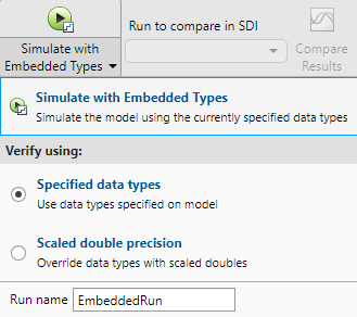 既定では、固定小数点ツールは範囲収集用の実行と検証用の実行を作成します。これらの実行の既定の名前はそれぞれ BaselineRun と EmbeddedRun です。