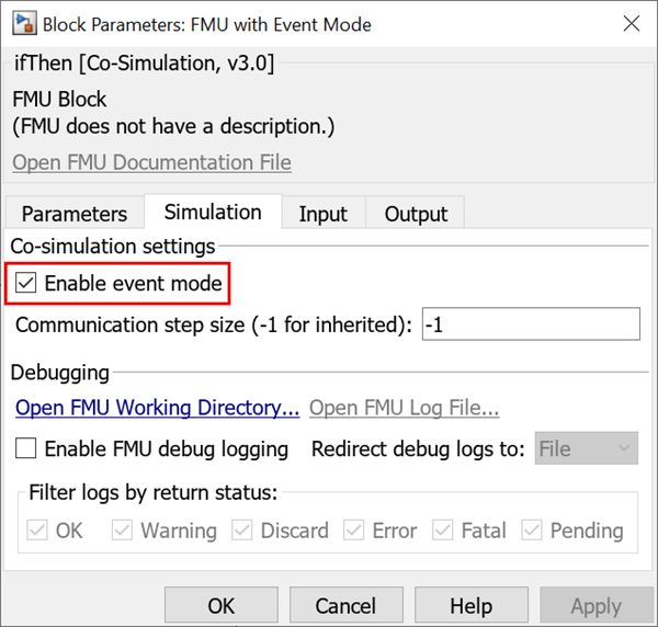 From the Simulation tab, select Enable Event Mode check box to simulate the FMU with Event Mode.