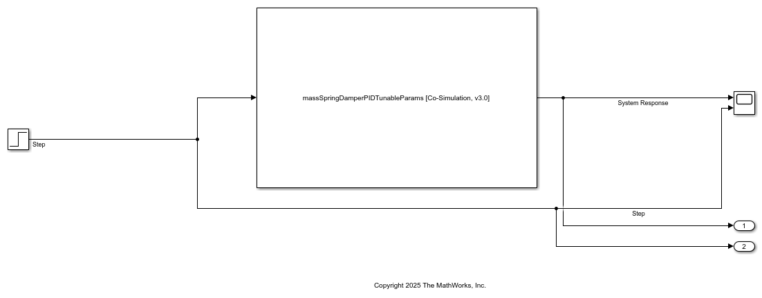 Setting System Target to FMU 'Co-Simulation' for model 'massSpringDamperPIDTunableParams'. Setting Hardware Implementation > Device Type to 'MATLAB Host' for model 'massSpringDamperPIDTunableParams'. ### Searching for referenced models in model 'massSpringDamperPIDTunableParams'. ### Total of 1 models to build. ### 'GenerateComments' is disabled for 'Co-Simulation' FMU Export. Build Summary Top model targets: Model Build Reason Status Build Duration =================================================================================================================================== massSpringDamperPIDTunableParams Information cache folder or artifacts were missing. Code generated and compiled. 0h 0m 7.4538s 1 of 1 models built (0 models already up to date) Build duration: 0h 0m 8.0761s ### Model was successfully exported to 'Co-Simulation' FMU 'massSpringDamperPIDTunableParams.fmu' in '/tmp/Bdoc26a_3163660_733221/tpd2a2f051/fmubuilder-ex81857754'.