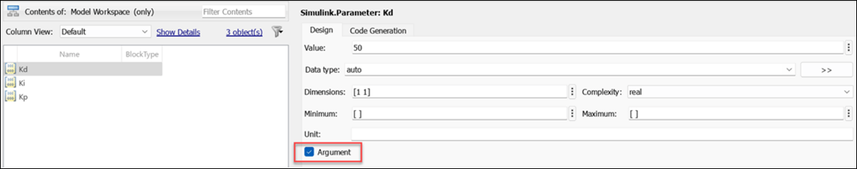 All the valid variables in the base workspace and design data section of the data dictionary is compatible for export as tunable parameter of the FMU. For more information about limitations on parameter tunability, see Limitations for Parameter Tunability in Generated FMUs. You must link the data dictionary to the Simulink model. For more information, see Migrate Models to Use Simulink Data Dictionary. To specify a model workspace variable for export as tunable parameter of the FMU, select the Argument option for the variable in the Model Explorer.