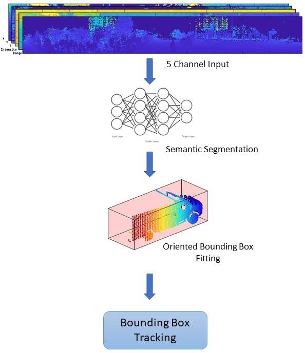 この例では、エゴ ビークルに取り付けられている LiDAR センサーによって取得された LiDAR 点群データを使用して、車両を検出、分類、追跡する方法を説明します。この例で使用する LiDAR データは、WPI Lidar Visual SLAM Dataset [1] に含まれているハイウェイ走行シナリオから記録されています。この例では、PointSeg ネットワークを使用して、オブジェクトのクラスを特定するために点群データをセグメント化します。Interactive Multiple Model フィルターを含む Joint Probabilistic Data Association (JPDA) トラッカーを使用して、検出された車両を追跡します。