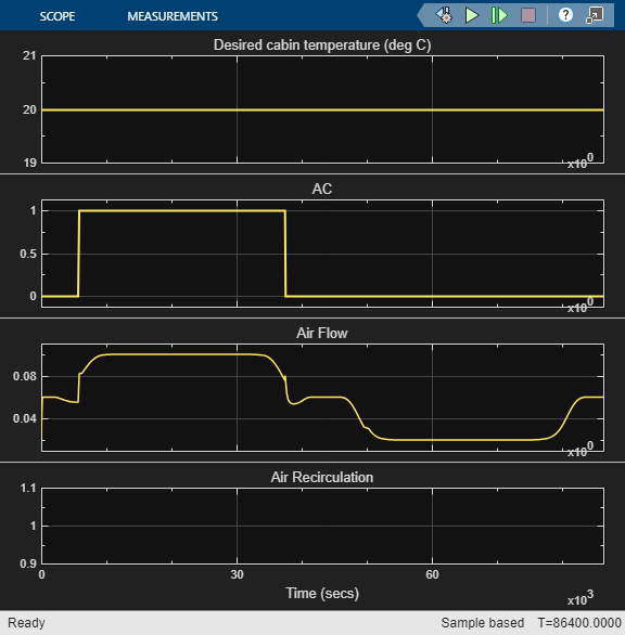 The vehicle HVAC model is adapted from the Vehicle HVAC System (Simscape) example, which models moist air flow in a vehicle heating, ventilation, and air conditioning system.