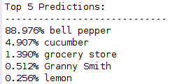 入力イメージ ファイルに対する上位 5 つの予測は次のようになります。