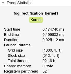[イベント統計] ペインには、選択したイベントの追加情報が表示されます。たとえば、fog_rectification_kernel1 は、開始時間、終了時間、起動パラメーター、共有メモリ、スレッドあたりのレジスタ数など、カーネルに関する情報を表示します。
