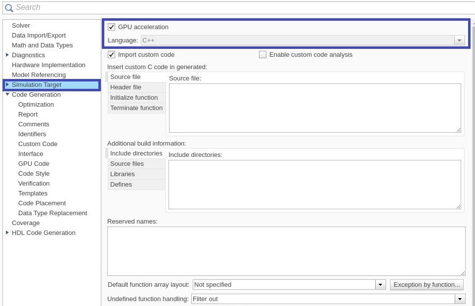 [コンフィギュレーション パラメーター] ダイアログ ボックスを開きます。[シミュレーション ターゲット] ペインで [GPU による高速化] を選択します。